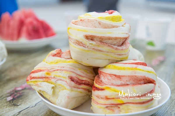 青海的花卷是帶有顏色,一開始我們以為是用食用顏料染成的,一問才知道是用姜黃等其他調(diào)料烹制而成,不僅僅外形上色彩豐富,而且會帶有咸味。