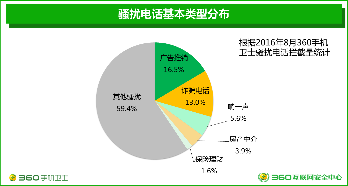 僅2016年8月,360手機(jī)衛(wèi)士就為全國(guó)用戶攔截各類騷擾電話34.3億次,平均每天攔截騷擾電話約1.11億次。其中,共攔截詐騙電話4.45億次,占到了當(dāng)月騷擾電話攔截總量的13.0%,平均每天攔截詐騙電話約1435萬(wàn)次?紤]到詐騙電話可能給用戶帶來(lái)的經(jīng)濟(jì)損失和其他嚴(yán)重后果,詐騙電話顯然已經(jīng)成為危害最為嚴(yán)重的騷擾電話類型。