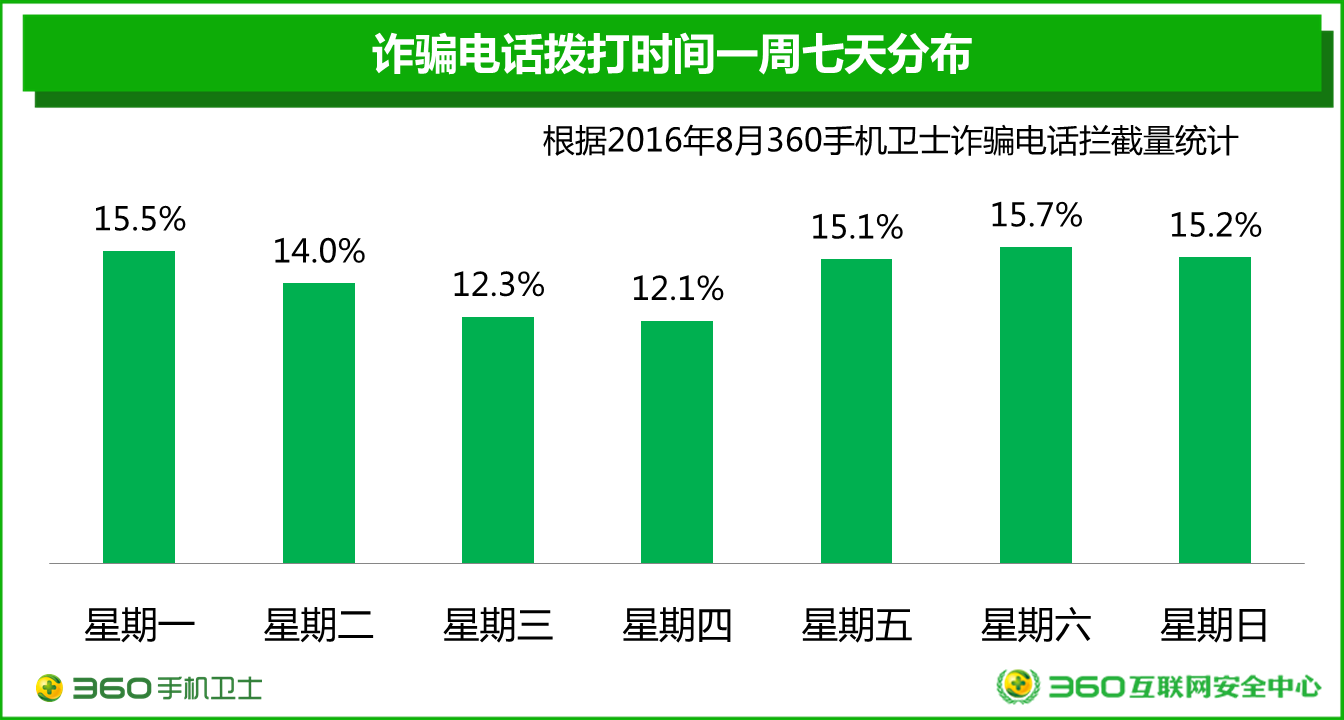 根據(jù)2016年8月360手機(jī)衛(wèi)士攔截詐騙電話情況的抽樣分析顯示:每周五到下一周的周一,每天詐騙電話呼叫量均超過了一周總量的15%,而周二到周四的呼叫量則相對(duì)較低。報(bào)告認(rèn)為造成這種情況的主要原因在于,周末很多人都會(huì)獨(dú)自在家,有空閑時(shí)間,而且身邊沒有可以給自己提醒的人,被騙子成功詐騙的幾率也就更高。騙子們也因此選擇在周末來(lái)?yè)艽蚋嗟脑p騙電話。