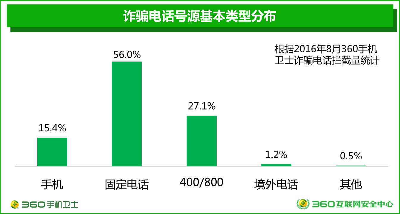 根據(jù)2016年8月360手機(jī)衛(wèi)士攔截詐騙電話情況的抽樣分析顯示:在詐騙電話的號(hào)碼源中,固定電話呼出的詐騙電話數(shù)量最多,占所有詐騙電話呼叫量的56.0%;其次是400/800電話,占比為27.1%;手機(jī)呼出的詐騙電話占詐騙電話呼叫總量的15.4%;此外,還有1.2%的詐騙電話來(lái)自境外呼入?梢,固定電話和400/800號(hào)碼更應(yīng)該成為詐騙電話治理的重點(diǎn)對(duì)象。