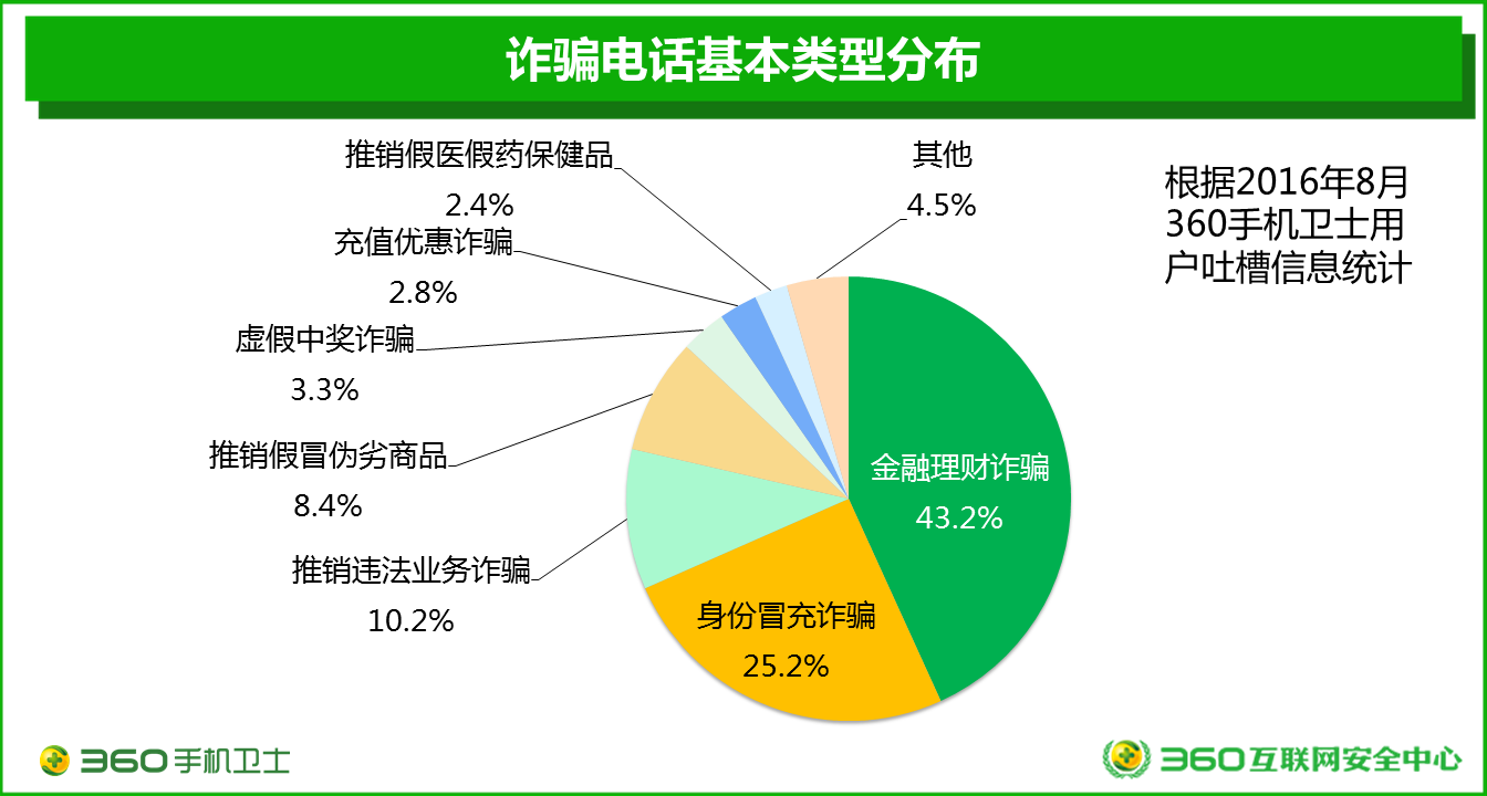根據(jù)2016年8月360手機(jī)衛(wèi)士用戶的“吐槽信息”的統(tǒng)計(jì)分析顯示,在用戶接到所有的詐騙電話中,虛假的金融理財(cái)詐騙最多,占43.2%,此類詐騙在北上廣深等大城市尤其盛行;其次是身份冒充詐騙,占25.2%。兩類詐騙相加占比68.4%。在身份冒充類詐騙中,冒充電信運(yùn)營(yíng)商的詐騙數(shù)量最多,占比為26.0%;其次是冒充領(lǐng)導(dǎo),占21.2%;排名第三的是冒充快遞,占14.3%。